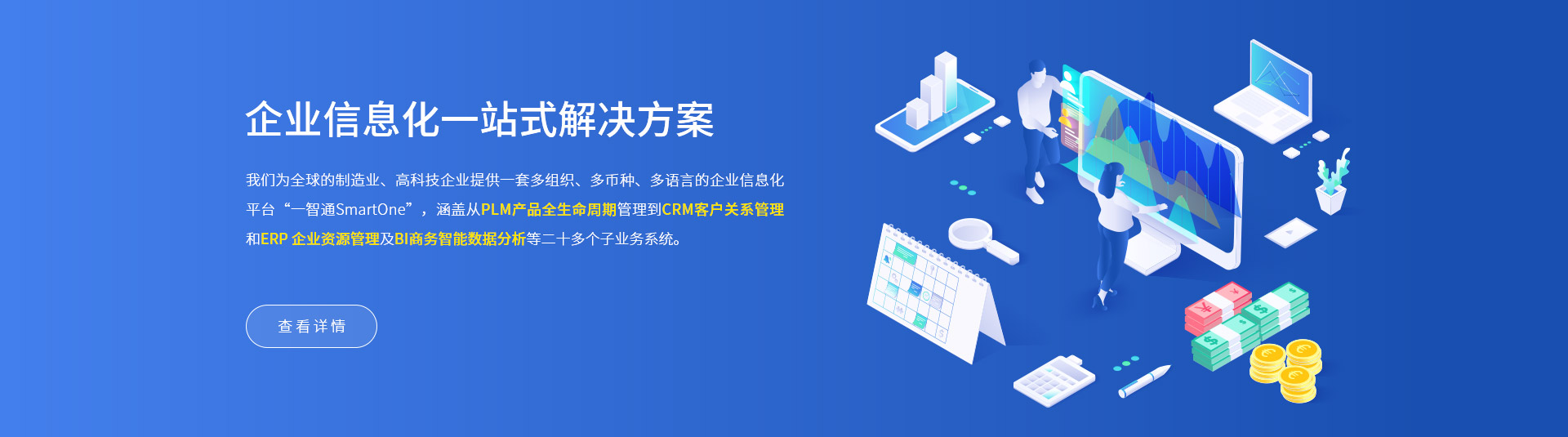 一智通(SmartOne)企業(yè)信息化一體化信息管理方案,涵蓋從 PLM 產(chǎn)品全生命周期管理 到CRM客戶關(guān)系管理和ERP企業(yè)資源管理及BI商務(wù)智能數(shù)據(jù)分析等二十多個子業(yè)務(wù)系統(tǒng)。