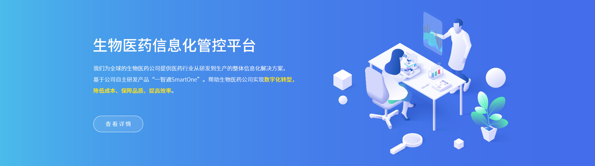 我們?yōu)槿虻纳镝t(yī)藥公司提供醫(yī)藥行業(yè)從研發(fā)到生產(chǎn)的整體信息化解決方案,基于公司自主研發(fā)產(chǎn)品“一智通SmartOne”。幫助生物醫(yī)藥公司實現(xiàn)數(shù)字化轉(zhuǎn)型,降低成本、保障品質(zhì)、提高效率。